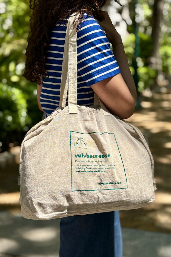 Luce con orgullo nuestra bolsa de tela de algodón reciclado, con nuestra definición para una “Cucacontenta” — un símbolo de amor propio, bienestar natural y compromiso ético.